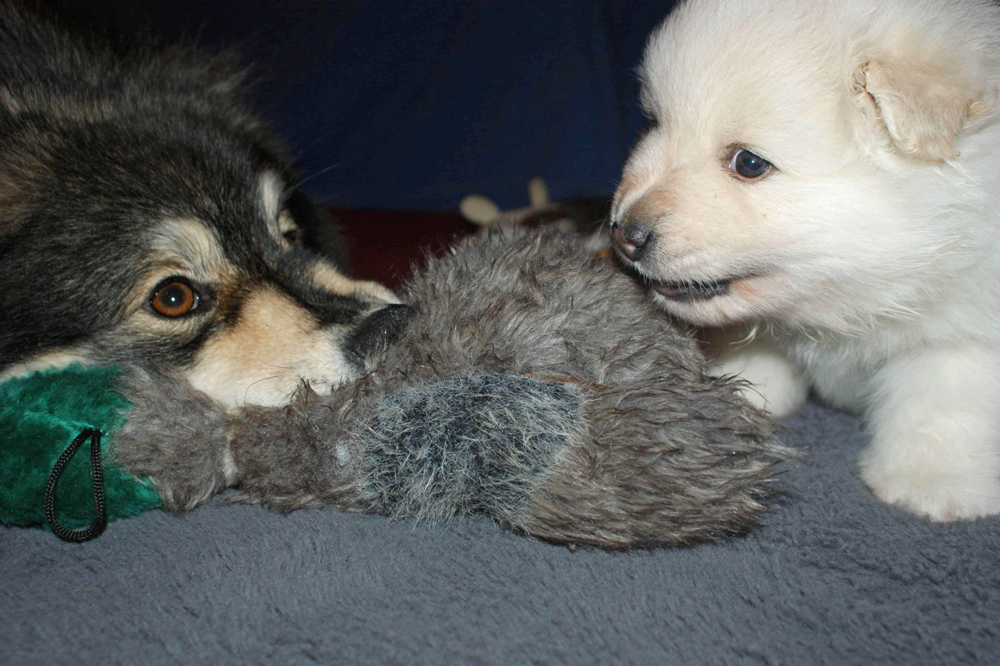 Joulu has reached that magical milestone of 8 weeks old and is as fluffy as can be and as cute as a very cute thing can get. Suvi could probably do with a break by now, as all mums by the time the puppies are 8 weeks old, but she won't be getting one. Mind you, she has no compunction in putting him in his place when necessary and letting him know when enough's enough. Perhaps he'll grow up with some lovely Lappy manners evident before the age of 2 or 3 years. Well, you never know.